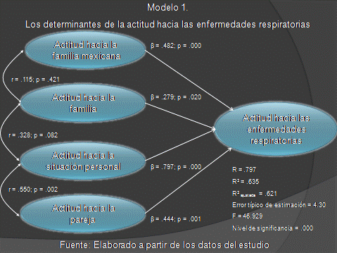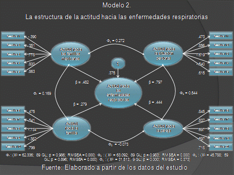 El modelo 1 demuestra las relaciones causales entre los factores y el constructo actitudinal. Puede observarse que los cuatro factores tienen una incidencia directa, positiva y significativa. Sin embargo, en el primer modelo de regresión lineal múltiple por pasos sucesivos, el factor referente a la situación personal es el principal determinante de la actitud hacia las enfermedades respiratorias. Esto significa que las personas evalúan el efecto de las enfermedades respiratorias a partir de su situación personal de costo y beneficio. Se trata de individuos más racionales que afectivos frente a las enfermedades respiratorias.
